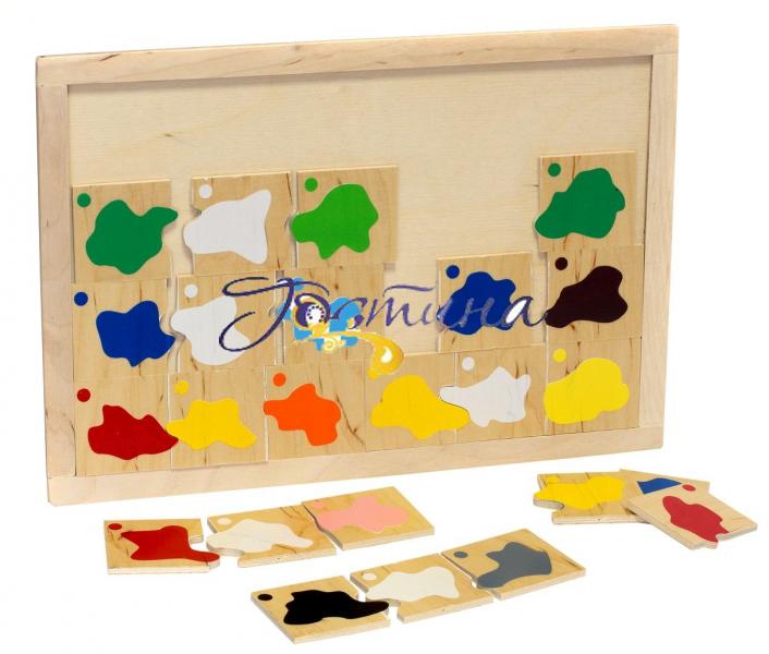 Класифікація 'Змішування кольорів' - дерев'яний планшет і 24 вкладишів, на яких зображена пляма з фарб різних кольорів. Змішування двох кольорів утворюють третій. Вкладиші розміщені в формі пазла - кожен з них має унікальний розріз, що спрощує завдання для малюка. Гра спрямована на: - розвиток у дитини зорового сприйняття, уваги, пам'яті;- вивчення кольорової палітри;- формування вміння аналізувати, виділяти основні ознаки предмета, об'єднувати предмети на основі декількох ознак;- активізацію процесу логічного мислення.