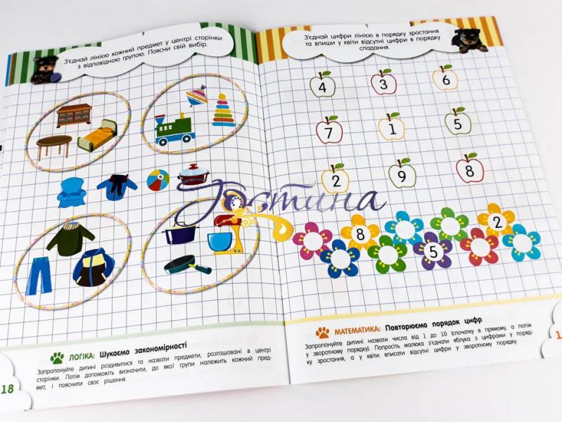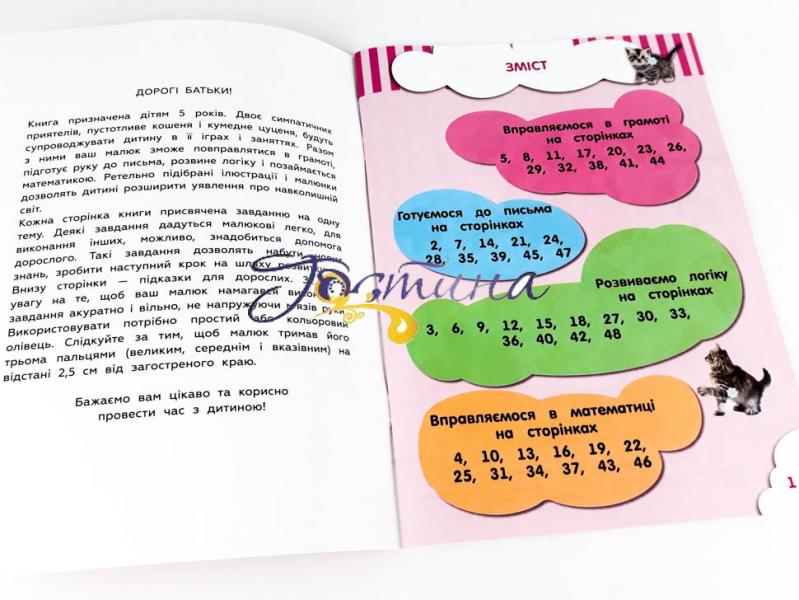 Розвивальні завдання різних типів для дошкільнят, які відповідають освітній програмі МОН України «Дитина», мають методичні рекомендації, щоб правильно зорієнтувати малюка на виконання завдання. Орієнтовані на вік 5 років.