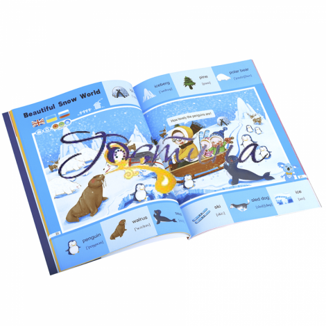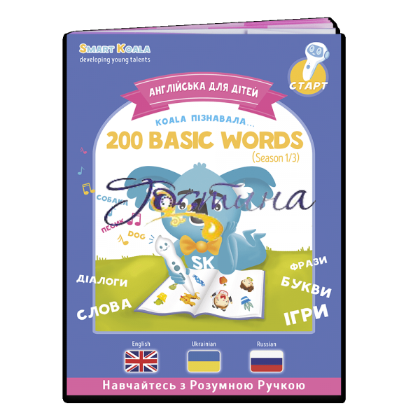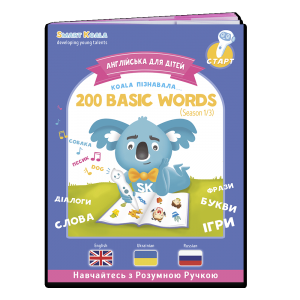 Інтерактивна книга для легкого вивчення іноземний мов. Перший посібник із серії книг Koala пізнавала «600 Перших слів англійської мови». Дитина легко вивчить 200 базових слів, прослухає понад 500 фраз, пройде 20 яскравих сцен з життя та 120 ігор на пам'ять та логіку. Весь матеріал озвучено носіями мови – англійська, українська, російська. На вас чекає весела практика в іграх та діалогах. Книга зробить першу подорож Вашої дитини незабутньою! Рекомендовано використовувати з Розумною Ручкою. Дітям від 2 років. ВАЖЛИВО: натисніть кнопку СТАРТ на обкладинці книги і Ручка ідентифікує книгу.