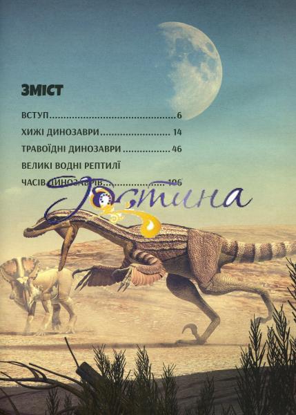 З цією книгою діти здійснять подорож у часі і дізнаються багато сучасних відомостей про динозаврів: чим харчувалися, як пересувалися, полювали і захищалися, а також хто жив в стороні з ними. Енциклопедія допоможе маленьким читачам дізнатися все найцікавіше про доісторичних рептилій, розвинути пам'ять, а також поповнити словниковий запас.