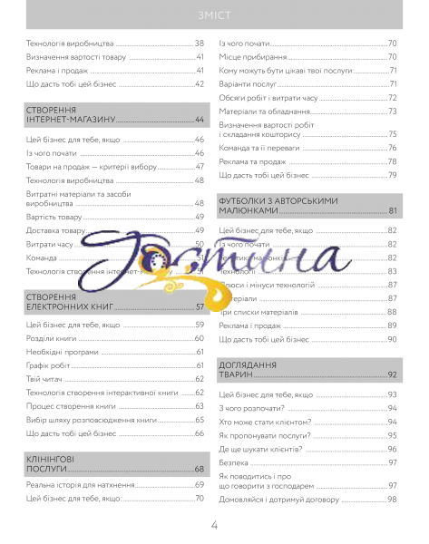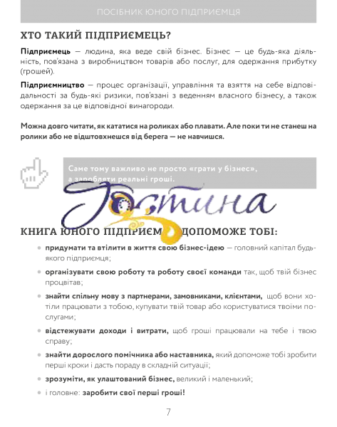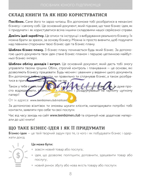 Ця книга — важливий крок підлітка в організації власної прибуткової справи. Адже в ній ідеться про реальні способи заробітку, наведені корисні поради щодо подієвого плану створення своєї справи. Книга юного підприємця допоможе організувати свою роботу та роботу команди; знайти спільну мову з партнерами, замовниками, клієнтами; відстежувати доходи і витрати; зрозуміти, як влаштований великий і маленький бізнес, і головне — заробити свої перші гроші! Створювати та розвивати власну справу — це цікаво! Переконайся в цьому сам!