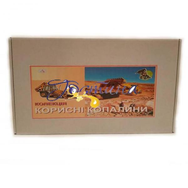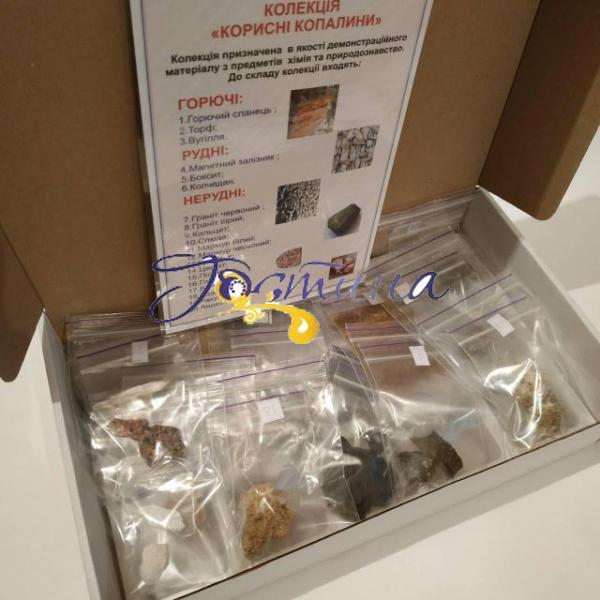 Містить не менше 20 натуральних зразків :  Торф Горючий сланець Вугілля Магнітний залізняк Боксид Колчедан Граніт червоний Граніт сірий Кальцит Слюда Мармур білий Мармур червоний Кварцит Цеоліт Пісок Глина Вапняк Пісковик Ракушняк Андезит