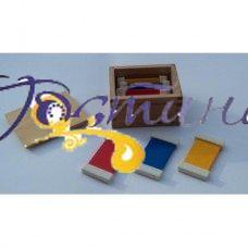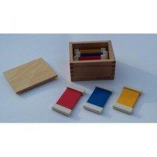 Прекрасний матеріал Монтессорі для розрізнення і вивчення основних кольорів. У наборі міститься дерев'яну скриньку, в якому зберігаються 3 пари табличок трьох основних кольорів: червоний, жовтий, синій. З двох сторін кожної таблички знаходяться білі планки, для того, щоб з ними було зручно працювати. Мета занять: вивчення кольорів, вміння сортувати колірні таблички. Заняття з ці м матеріалом проводиться при -Добре освітленні. Приклади проведення занять: Викладач дістає таблички і перемішує їх. Вибравши дві таблички одного кольору, вчитель кладе їх радом. Розглядати таблички слід беручи їх за прикріплені планки. Потім під першу пару табличок потрібно вибрати і покласти другу пару, потім третю. Пари табличок чітко відокремлюються одна від одної за кольором і завдяки білим планок, що розділяє їх. Малюкові потрібно повторити завдання по розрізнення пар, візуально порівнюючи їх. Навчившись розрізняти кольори на табличках, дитині пропонується, взявши табличку одного кольору знайти в кімнаті предмети аналогічного кольору. В ході занять дитина запам'ятовує назви кольорів і як вони виглядають, у нього розвивається дрібна моторика, тоншає зір, колірне сприйняття.