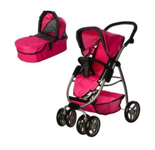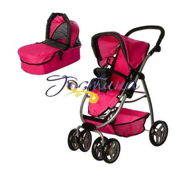 Вона виготовлена за аналогією з дитячою коляскою і має аналогічні функції, наприклад люльку коляски можна встановити обличчям до себе і від себе, також люльку можна використовувати як переноску. Оскільки коляска дуже міцна, з щільною водонепроникної тканини, з каркасом з металу і широкими колесами (передні 16 см, задні - 18 см), передні колеса поворотні - грати з такою коляскою можна як вдома, так і на вулиці в будь-яку погоду. В комплекті знімна люлька, спинку коляски можна регулювати по висоті (робити положення лежачи і сидячи).