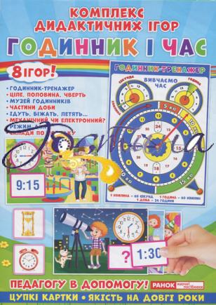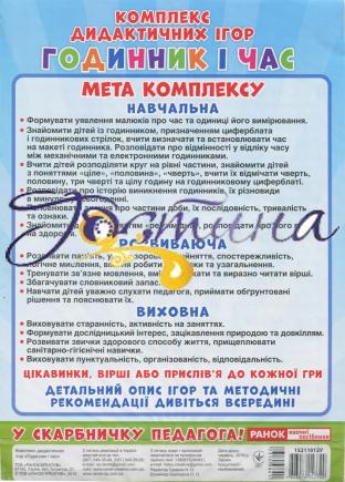 Мета комплексу:Навчальна- Формувати уявлення малюків про час та одиниці його вимірювання.- Знайомити дітей із годинником, призначенням циферблата і годинникових стрілок, вчити визначати та встановлювати час на макеті годинника. Розповідати про відмінності у відліку часу між механічними та електронними годинниками.- Вчити дітей розподіляти круг на рівні частини, знайомити дітей з поняттям 'ціле', 'половина', 'чверть', вчити їх відмічати чверть, половину, три чверті та цілу годину на годинниковому циферблаті.- Розповідати про історію виникнення годинників, їх різновиди в минулому і сьогоденні.- Поповнювати знання про частини доби, їх послідовність, тривалість та ознаки.- Знайомити дітей з поняттям 'режим дня', розповідати про його вплив на здоров'я.Розвиваюча- Розвивати пам'ять, увагу, зорове сприйняття, спостережливість, логічне мислення, вміння робити висновки та узагальнення.- тренувати зв'язне мовлення, вміння слухати та виразно читати вірші.- Збагачувати словниковий запас.- Навчати дітей уважно слухати педагога, приймати обґрунтовані рішення та пояснювати їх.Виховна- Виховувати старанність, активність на заняттях.- Формувати дослідницький інтерес, зацікавлення природою та довкіллям.- Розвивати звички здорового способу життя, прищеплювати санітарно-гігієнічні навички.- Виховувати пунктуальність, організованість, відповідальність.