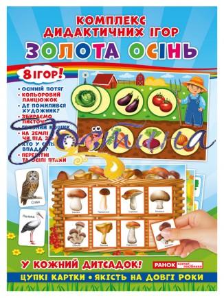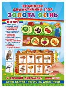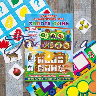 Знайомимо дошкільників з порою року. У комплекті пропонується 8 навчальних ігор на тему осені, різноманітні цікаві вірші та прислів’я до кожної гри, а також методичні рекомендації.Хід гри: необхідно скласти, зібрати, сортувати, розділити на ігровому полі кружечки чи квадратики відповідно до поставлених завдань гри. Наприклад, у грі «Осінній потяг» вивчаємо осінні фрукти та складаємо їх у вагони за кількістю від 1 до 5, а у «Кольоровому ланцюжку» сортуємо предмети за кольором.Мета цього комплексу:НАВЧАЛЬНА- Формувати уявлення дітей про сезонні зміни в природі, кольори осені. Поглиблювати знання про ознаки осені, осінні прикмети.- Знайомити з осінніми місяцями та значенням понять: рання осінь, золота осінь, підзимок.- Розповідати про світ тварин та їх пристосування до природних умов восени.- Закріпити знання назв та характерних ознак осінніх овочів та фруктів, формувати вміння розрізняти їх за зовнішнім виглядом та особливостями збору.- Дати знання про їстівні та отруйні гриби, вчити розрізняти їх.РОЗВИВАЮЧА- Розвивати пам'ять, увагу, спостережливість і допитливість, логічне мислення, вміння робити висновки та узагальнення.- Формувати культуру мовлення, розвивати зв'язне мовлення, вміння слухати та виразно читати вірші.- Збагачувати словниковий запас.- Навчати дітей уважно слухати вихователя та давати відповіді на його питання.- Розвивати естетичне сприйняття та відчуття кольорів.ВИХОВНА- Виховувати у дітей інтерес і любов до рідної природи, бажання берегти довкілля.- Формувати посидючість, бажання працювати в групі, слухати та поважати думку оточуючих.Формат: 21х30 см.Набір містить:- картки до ігор (57 шт., із цупкого картону)- ігрове поле (7 шт.)- методичні рекомендації