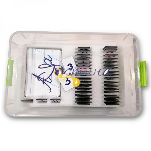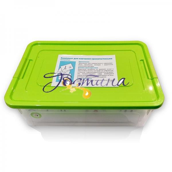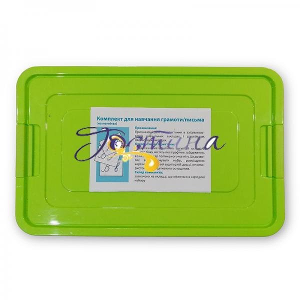Використовується в якості демонстраційного матеріалу під час вивчення української мови в початкових класах. Склад: - зразки каліграфічного письма букв українського алфавіту (великих і малих) - не менш ніж 33 од.; - каса букв (не менше ніж 4 картки кожної літери) - не менш ніж 132од.;- набір графічного позначення мовних одиниць (звуки) - не менш ніж 15од.;- ложемент-вкладка для зберігання;- скриня для зберігання;- прозора кришка до скрині.Дидактичні матеріали на магнітній основі з одного боку містять поліграфічне зображення, а з іншого – шар полімерного магніту. Це дозволяє використовувати набір, розміщуючи картки на металевій аудиторній дошці, не використовуючи додаткового оснащення.