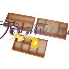 Кожен піднос має одне велике відділення, де зберігаються разом зібрані сортовані предмети і різну кількість невеликих відділень: три, чотири, шість, куди малюк розкладає предмети при роботі.