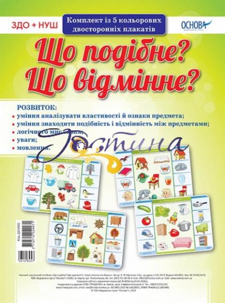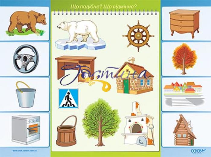Комплект містить 5 двосторонніх плакатів, які допоможуть вихователю ЗДО та вчителю НУШ сприяти розвитку у вихованців: - уміння аналізувати властивості й ознаки предметів; - уміння знаходити подібність і відмінність між предметами; - логічного мислення; - уваги; - мовлення. Плакати допоможуть вчителю та вихователю під час організації навчального процесу на уроці математики, розвитку зв’язного мовлення, та заняттях з розвитку логіки. Плакати можуть бути використані у фронтальній, груповій та індивідуальній роботі. Як користуватися плакатом? Кожен плакат складається з центрального блоку та 8-ми менших за розміром блоків: Вчитель або учні обирають зображення з меншого блоку, наприклад, їжак. Далі потрібно у центральному блоці знайти предмет схожий на їжака — кактус. Після цього можна задавати питання: «Чим вони схожі?», «Чим вони відмінні?» тощо.