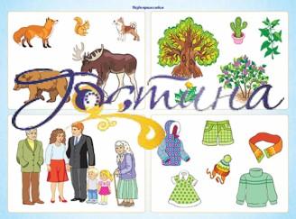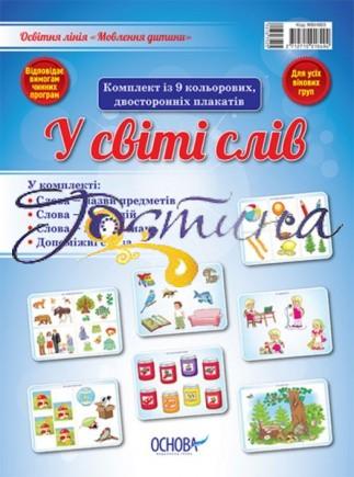 Комплект містить 9 кольорових плакатів.У комплекті:Слова — назви предметівСлова — назви дійСлова — назви ознакДопоміжні слова