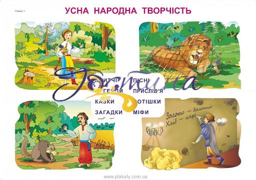 Список плакатів: Усна народна творчість Міфи про створення світу Слов'янський міф Перша історія України Козак Голота На новій землі Мій рідний край Зворушлива дружба Майстерність гончарів Тарасові стежки Дрімають села Давня весна Хто сказав, що… За мотивами українських казок Чарівні казкові образи Людина починається з добра Співуча пір'їнка Рідний портрет.