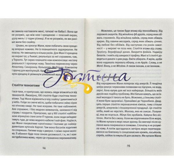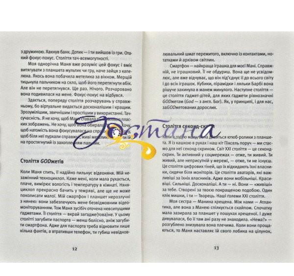 Ця книжка — про комунікацію, але цілком із незвичного ракурсу. Порівнюючи спілкування дорослих і дітей (на прикладі своєї доні), авторка робить несподівані відкриття. Зокрема про те, що ми, дорослі, втрачаємо наше дитяче вміння комунікувати по-справжньому: на рівні слів, мовчання, співопису, обіймів, цілунків, запахів тощо. А ще втрачаємо свіжий погляд на себе, на світ і на речі у ньому.