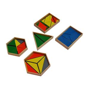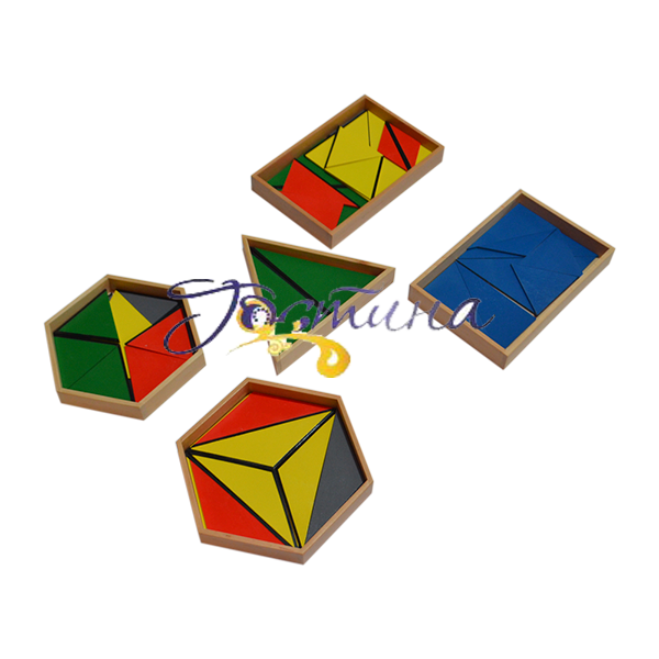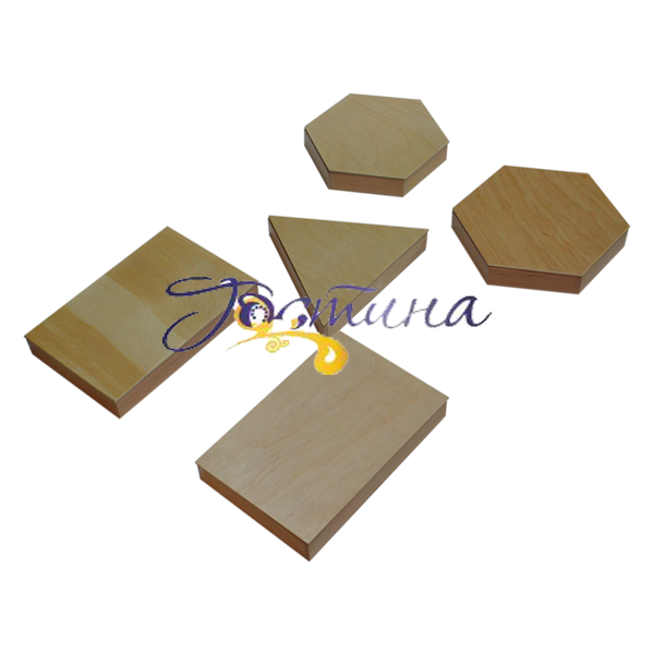 Опис матеріалу: матеріал Конструктивні трикутники складається з 5 дерев'яних ящиків: 1 великий шестикутний, 1 маленький шестикутний ящик, 1 трикутний і 2 прямокутних,
