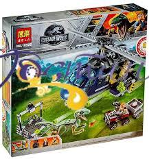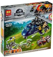 Конструктор Погоня за Блю на вертольоті, відтворить сцену неабиякої боротьби за велоцираптора. Представлений ігровим набором, що включає до свого складу 415 деталей, він дозволить Оуену врятувати свою улюбленицю.Ключовий об'єкт збірки - вертоліт, виконаний в темно-синьому, світлому і темному тонах сірого кольору. У його носовій частині розташовується кабіна управління з безліччю панорамних вікон. За нею в моделі літального апарату Jurassic World Погоня за Блю на вертольоті розташовується пасажирський відсік з двома жовтими сидіннями.По обидва боки від них відходять довгі стійки шасі, на яких можна закріпити оснащену шістьма набоями гармату або світловий прожектор. Розмір вертольота становить 11х27х20 см.На даху повітряного судна Юрський період Погоня за Блю на вертольоті розташовується чотирилопатевий гвинт з функцією обертання. У задній частині літального апарату знаходиться використовується для зберігання яєць і зброї вантажний відсік. Тут же в моделі конструктора Jurassic World Погоня за Блю на вертольоті розташовується гак для транспортування клітини з ящером. Досить тільки нагнати тварина, приспати його пострілом дротика зі снодійним і в клітку перекласти.