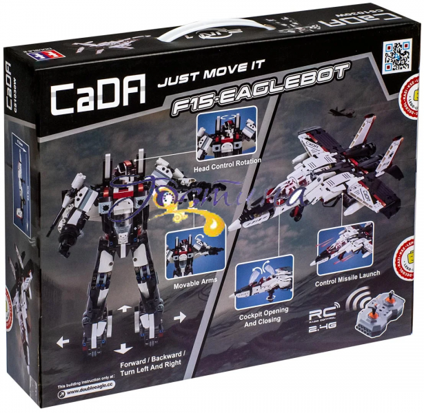 Конструктор C51030W являє собою набір 2 в 1 для побудови робота-трансформера і літака на радіоуправлінні і містить 917 деталей! Робот-Трансформер CaDa Detech С51030W в зібраному вигляді дуже рухливий і маневрений, так само обертається голова і руки робота. Другий варіант збірки - літак. Літак може стріляти пластиковими стрілами, які йдуть в комплекті, активуючи постріли з пульта. Крім деталей корпусу і коліс, в комплект входять 2 електродвигуна, приймач, акумулятор 7.4 і пульт!