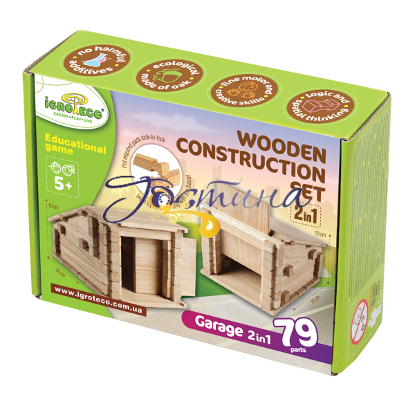 Конструктор «Гараж 2 в 1» призначений для діток від 5-ти років, дозволить Вашій дитині зібрати 2 моделі дерев'яного гаража з одного набору: більшу модель з висувними воротами вбік, меншу - ворота висуваються вгору. «Гараж 2в1» чудово доповнює ігри з машинками. Маючи більше конструкторів ТМ «Ігротеко», малюк може збудувати ціле місто з автопарком!