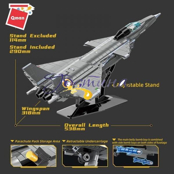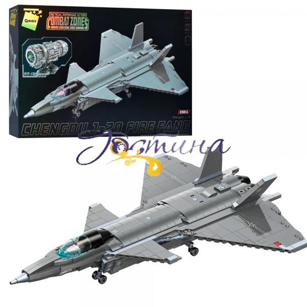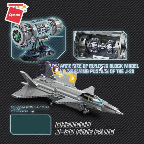 Конструктор Qman 23011 Винищувач J-20 Чорний орел є прототипом китайського винищувача п'ятого покоління. Був прийнятий на озброєння в 2017 році і є відносно новою моделлю. Усередині літака можна помістити екіпаж з одного пасажира. Маса порожнього винищувача становить 17 000 кг. Чорний орел долає дальність польоту в 5500 км, а бойовий радіус дії складає 2000 км.