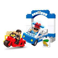 У наборі поліцейська дільниця, поліцейська машина, фігурки та аксесуари, мотоцикл.