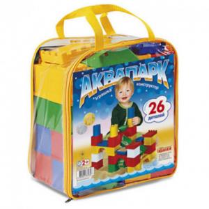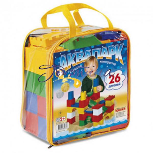 Конструктор 'Аквапарк', упаковка - сумка ПВХ на блискавці. У комплекті 26 деталей різної форми, кольору і розміру. Матеріал - пластик.