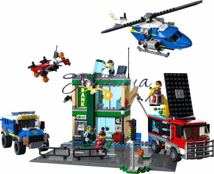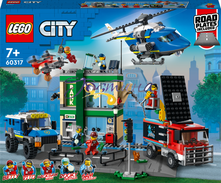 До цього конструктора LEGO входить функціональна будівля банку, сміттєва вантажівка, яка перетворюється на машину для пограбування, поліцейський вертоліт, поліцейська вантажівка та 6 мініфігурок, включаючи 5 популярних персонажів із серіалу «Пригоди в місті LEGO».
