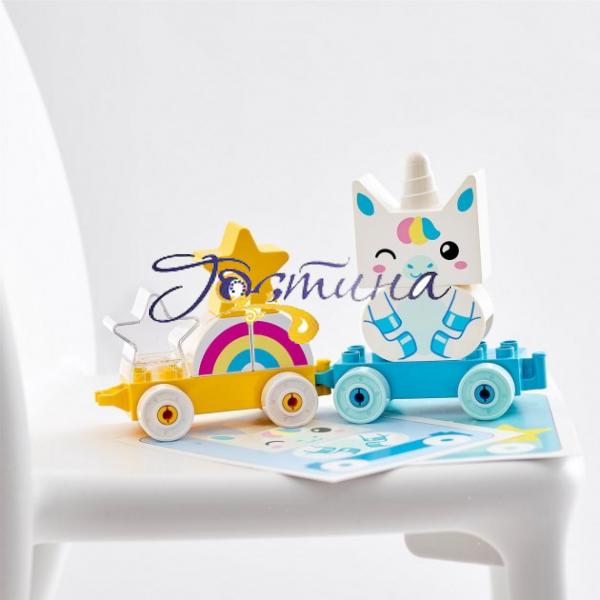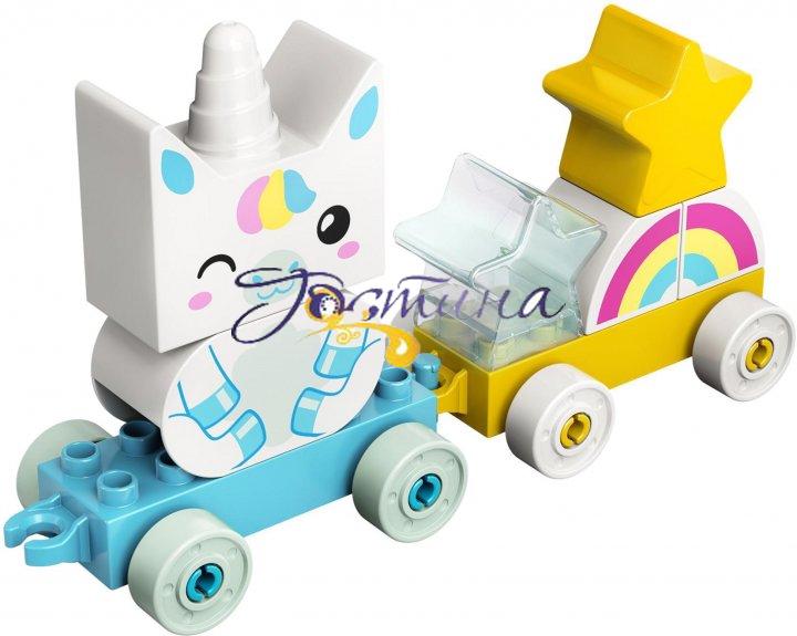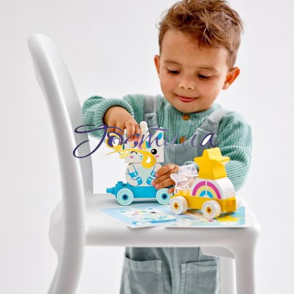 Цей милий єдиноріг дає змогу займатися з малюком творчими іграми і вчити його розпізнавати форми та кольори. Можливості гри та навчання безмежні: з гладкими фігурами легко впоратися маленькими дитячими руками, і їх можна брати, прикріплювати і прибирати з вагонів, що котяться. Щоб було ще цікавіше, діти можуть об'єднати поїзд з іншими іграшками LEGO DUPLO на колесах.