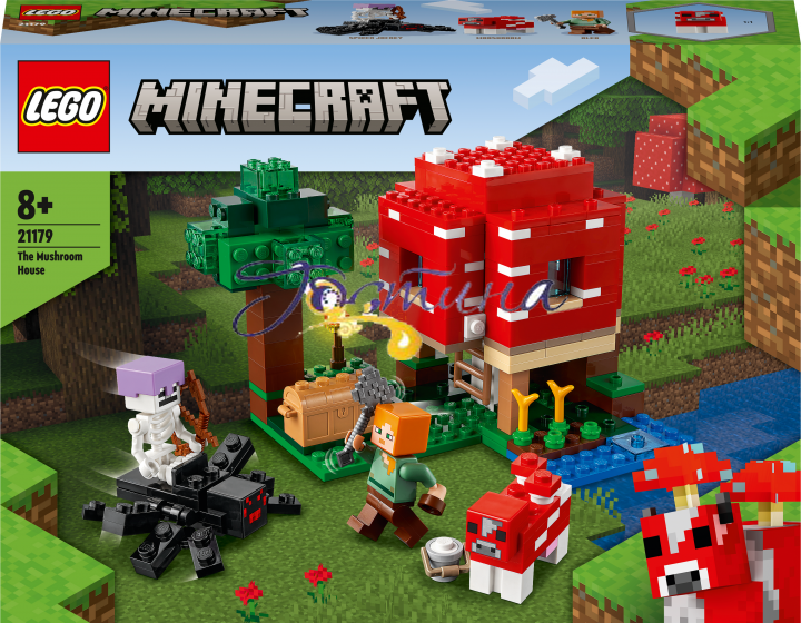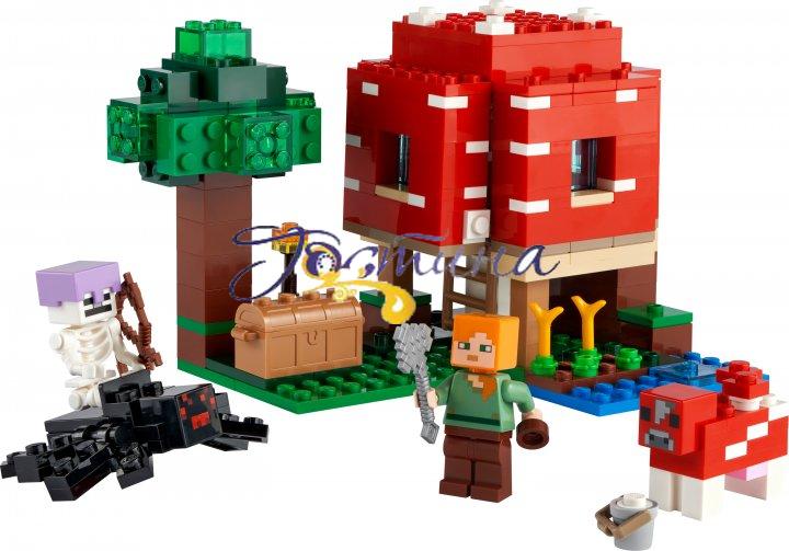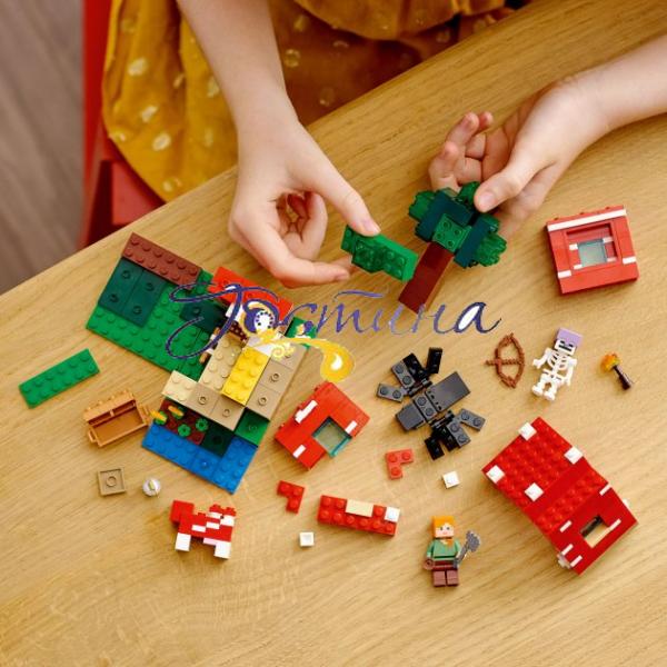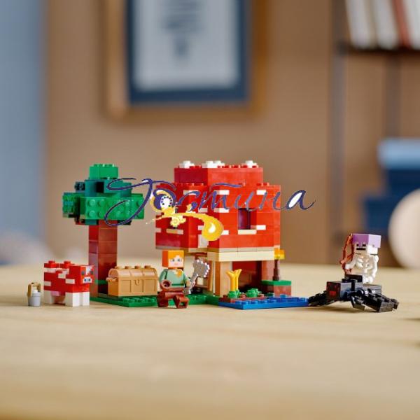 Збудуйте будинок усередині гігантського гриба! Підійміть дах та стіни, щоб використовувати верстат і меблі. Зовні допоможіть Алекс використати миску, щоб зібрати суп грибної корови. Обережно, наближається павуковий вершник! Що ви зробите — схопите сокиру, сховаєтеся в будинку або зіб'єте зі скелета шолом, щоб він згорів на сонці? Вирішувати вам.