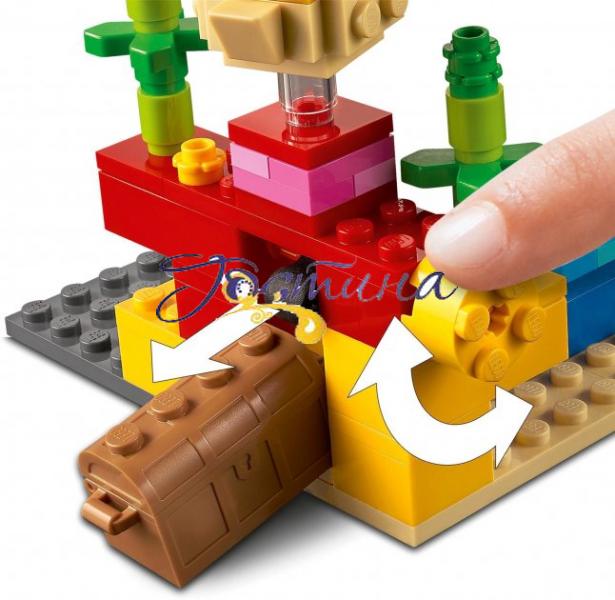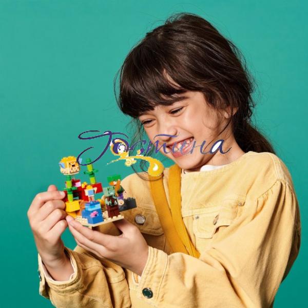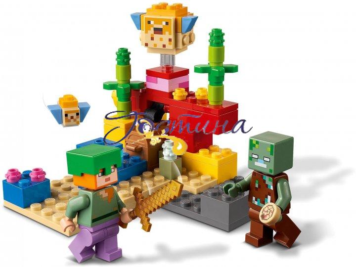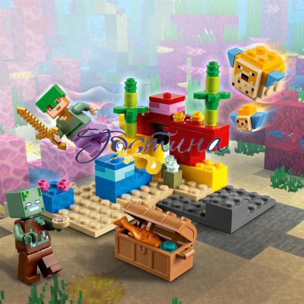 Приєднуйтесь до Алекс і вирушайте в глибини океану Minecraft, щоб відшукати скарб, захований на барвистому кораловому рифі. Привітайтеся з двома дружелюбними скелезубами. Переверніть великий жовтий камінь, щоб з'явилася скриня зі скарбами. Що ж є усередині? Просто риба… і перлина! Обережно! До вас іде потопельник! Чи зможе Алекс перемогти зомбі та захистити скарб? Це вирішувати вам.
