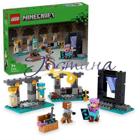 Цей набір для будування для дітей включає 2 знайомі фігурки: героїню Minecraft Алекс зі щитом та алмазним мечем і працьовитого Зброяра. У наборі є три середовища для дослідження: робоча зона з ковадлом, піччю, точилом і наповненим лавою казаном; кімната для демонстрації обладунків зі скринею, що містить золоту сокиру, зачарований тризуб, незеритовий меч, щит та інші ресурси Minecraft; а також портал у Нижній світ із дверцятами, що відчиняються й ведуть гравців до наступної пригоди. Ця пригодницька іграшка Minecraft також є чудовим додатковим набором для сюжетної гри, який легко поєднується з іншими наборами LEGO Minecraft, зокрема з набором «Засідка біля порталу в Нижній світ» (21255), що продається окремо.