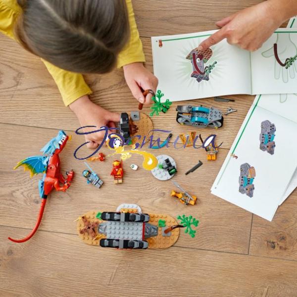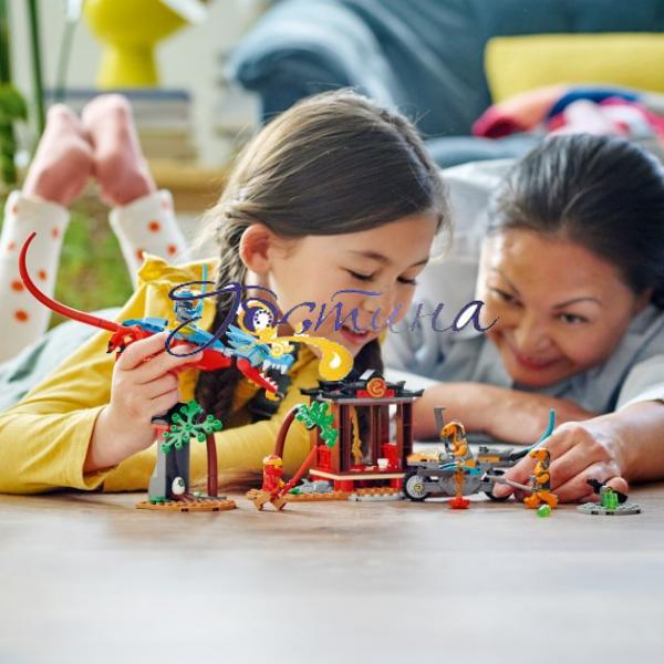 Вступайте в битву з Нією та її ніндзя-драконом проти пари настирливих воїнів-змій! Ці вороги відчайдушно хочуть схопити яйце дракона, яке Кай захищає в храмі ніндзя. Підступний змій готовий кинутися в погоню на своєму надшвидкому мотоциклі, а Кобра-механік озброєний списом і готовий вистрілити у вас своєю потужною катапультою. Важливо, щоб ви перемогли, щоб врятувати Ніндзяго-Сіті!
