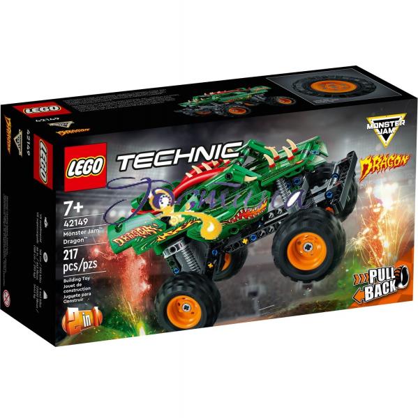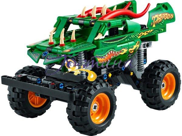 Гадаєте, впораєтеся з жаром Monster Jam? Час випробувати ваші навички з допомогою набору LEGO Technic Monster Jam Dragon. Зберіть вантажівку з лютими драконячими шипами, рогами й вогняними деталями. Потім потягніть назад двигун, щоб прискорити його — або виконайте круті трюки, як справжній учасник змагань! Коли настане час для чогось нового, перетворіть вантажівку на Багі «Крокодил».