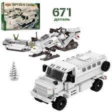 Конструктор – прекрасна розвиваюча іграшка. Хороший дитячий конструктор відкриває простір для творчості, дає дитині можливість проявити свої здібності і допомагає розвивати їх. Конструктори можуть покращувати дрібну моторику пальців у малюків, а у дітей старшого віку логіку і уяву, фантазію і розрахунок пропорцій, а також багато іншого. військова техніка (машина,снігохід) 671 деталь У коробці 54,5-39-8см