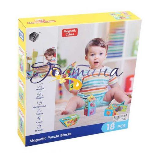 Конструктор магнітний HD 351 А призначений для самих маленьких користувачів, малюків від 1 рочку. У набір входить 18 деталей (9 трикутників, 9 квадратів), він допоможе весело будувати і пізнавати навколишній світ: форми і тварин.