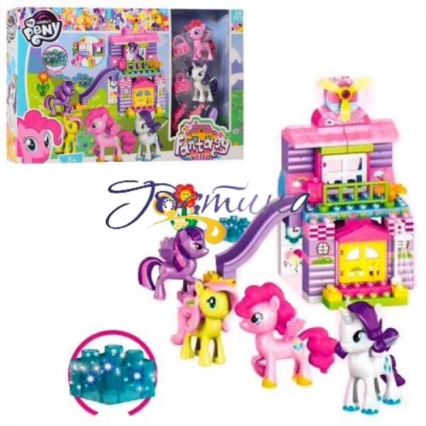 Конструктор My Little Pony (поні) арт. 8723Набір складається з 52 деталей, з яких збирається барвистий будиночок для поні - улюблених персонажів мультфільму My Little Pony. У наборі 2 конячки (розміром 9 см).Деталі великі, сумісні з Lego Duplo.Розмір упаковки: 53-35-9 см