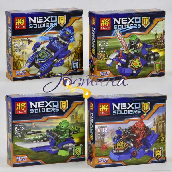 Зустрічайте команду відважних хлопців, своєрідних космодесантников, лицарів NEXO з конструктором "NN" 79275 "Космодесантники-солдати" в 4-х варіантах. Хоробрі і благородні лицарі протистоять злобному королівському блазню Джестро і його полчищам лавових монстрів. Кожен з наборів серії містить 1 міні-фігурку воїна на своєму літальному апараті. Збери свою армію лицарів майбутнього і воюй з силами зла