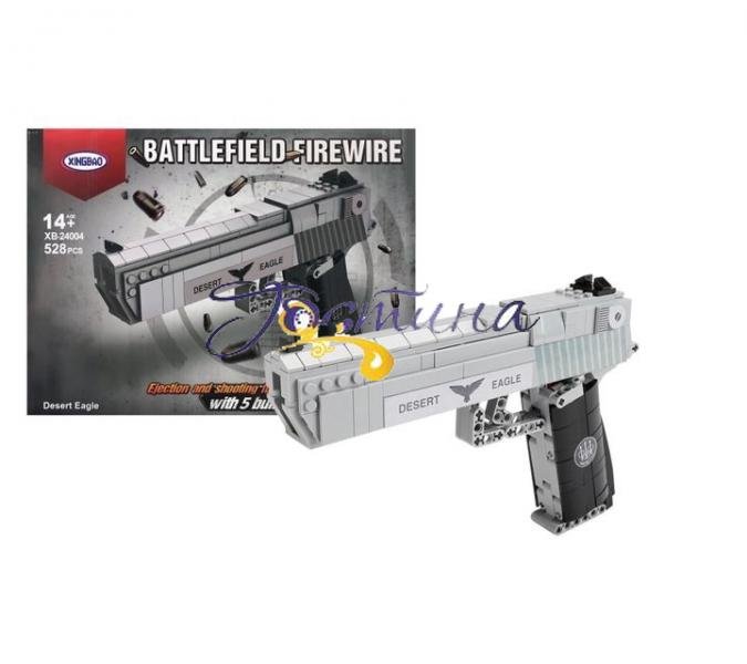 Реальний великокаліберний пістолет, модель якого збирається із цього набору, широко відомий у всьому світі. «Пустеля орел», так перекладається його назва, використовує для стрілянини «забійні» пістолетні патрони – 50 Action Express (12,7x32,6 мм), тобто калібру великокаліберних кулеметів. Розглянутий набір XB-24004 Xingbao Пістолет Desert Eagle дозволить дитині стати власником цієї унікальної зброї, яка: - за розмірами максимально наближена до оригіналу - її довжина становить 24,5 сантиметра, - можна заряджати пластмасовими боєприпасами і стріляти, як із справжнього. Підліток з подібною суперзброєю з конструктора XB-24004 Xingbao Пістолет Desert Eagle зможе відчути себе мисливцем, спортсменом або "застосовувати" грізний пістолет при самозахисті від нападу диких звірів або злочинців Розмір упаковки: 45х7х33 см Розмір гвинтівки в зібраному вигляді: