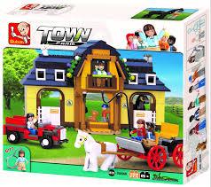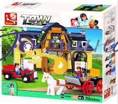Серед широкого різноманіття аналогів конструктора Lego виділяються ігрові набори Sluban. Всі іграшки даної торгової марки відрізняються високою якістю виконання і наявністю деталей, які надають іграшці максимальної реалістичності. Крім цього, конструктори Слубан: характеризуються простотою збірки (не потрібно прикладати зусиль для з'єднання блоків і подальшої їх розбирання); повністю сумісні з Лего; відрізняються високою деталізацією елементів; комплектуються інструкцією, де покроково описано всі етапи створення споруди. Універсальний набір «Ферма» Слубан Модель M38-b0560 - новинка сезону, яка займає лідируючі позиції серед аналогічних тематичних наборів. Даний блоковий конструктор завойовує увагу споживачів своїм стилем виконання: яскраві кубики (причому це не помітні, їдкі кольори, а пастельні, приємні відтінки); велика кількість аксесуарів, що вносять різноманітність в сюжетну лінію; наявність ігрових модулів, які можна використовувати в інших локаціях (наприклад автомобіль - в поліцейській тематиці, кінь з каретою - для гри в Середньовіччі). Двоповерхова будівля з оригінальними екстер'єрними рішеннями Ферма M38-b0560 є невеличке будівництво, що складається з 2-х поверхів. На другому поверсі проживають працівники садиби: вусатий тато, довговолоса мама, смішний малюк, який любить гратися зі своїм псом-дворняжкою. Житлові кімнати розташовані в мансарді. Для того, щоб господарі ранчо могли спостерігати за тим, що відбувається у дворі, будівельники звели на 2-му поверсі широкий балкон: огорожа складається з міцних фігурних стовпчиків, виконаних з дерева; на балюстраді встановлені вазони з дивовижними кольорами; простір балкона висвітлюють потужні ліхтарі, вмонтовані в ніші першого поверху. Внизу розташувалися світло: склад, стайня, гараж. В стійлі для коней нудьгує доглянутий чорний скакун - він чекає, коли йому принесуть свіжу оберемок сіна. Довго сумувати коню не доведеться: до загону під'їжджає невеликий трактор, в вантажну частину якого фермер завантажив свіжоскошену траву для конячки.