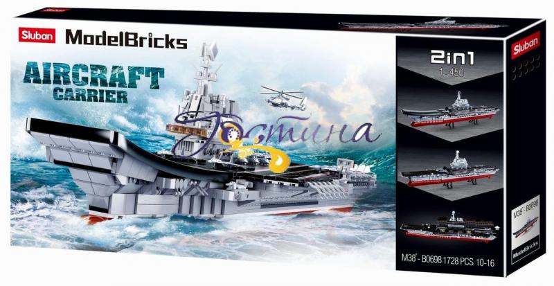 Конструктор Sluban Авіаносець - ідеальний подарунок для любителів військових іграшок. З деталей збирається авіаносець в масштабі 1: 450 довжиною 68 см! Він укомплектований радаром, також в комплекті 8 літаків і 4 вертольоти. Велика злітно-посадкова смуга ідеальна для приземлення іграшкових винищувачів. У набір входить тисяча шістсот тридцять шість пластикових деталей, які легко і надійно кріпляться одна до одної.