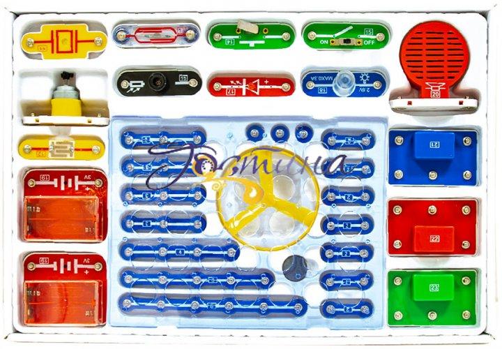 До комплекту також входить інструкція, за допомогою якої малюк зможе зібрати 201 електросхему, що дає змогу на практиці опанувати ази керування світлом, звуком, електрикою та водою.