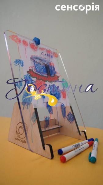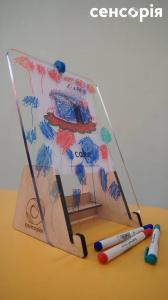 Матеріали: прозора акрилова пластина, фанера, набір маркерів сухого стирання.Розмір панелі: 22х30 см.