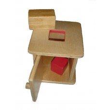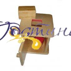 Розвиваюча іграшка - дерев'яна коробочка з дверцятами, квадратним отвором на кришці, 3 кубика, 2 фігурки пофарбовані в рожевий колір. Малюк вкладає фігурку в отвір, відкриває дверцята за невелику ручку, дістає кубик з коробочки, закриває дверцята і повторює все знову. Матеріал знайомить дитину з геометричною фігурою, її проекцією на площині, розвиває зорово-моторну координацію рухів, дрібну моторику, концентрацію уваги, дрібну моторику. Формується звичка зорового і тактильного зіставлення фігур і форм. Один з найулюбленіших матеріалів малюків, адже саме у віці від півроку до 2-х років дітям дуже подобається розкладати різні предмети по ємностей і коробочках вправлятися в відкриванні дверцят. Отвір для вкладання куба виділено - забарвлене в рожевий колір. Деталі іграшки ретельно відшліфовані і оброблені, покриті лаком. У комплекті: коробка і кубики (3шт-2окрашенние рожеві, 1 незабарвлений