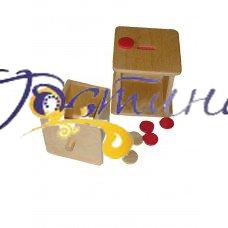 Один з найулюбленіших матеріалів малюків, адже саме у віці від півроку до 2-х років дітям дуже подобається розкладати різні предмети по ємностей і коробочках вправлятися в відкриванні дверцят і висуванні ящиків. У комплект входять: дерев'яна коробочка з висувним ящиком і невеликий прорізом зверху, 6 дерев'яних «монеток» забарвлених в рожевий колір. Малюк вкладає «монетки» ребром в отвір, висуває шухлядку, дістає маленькі диски з коробочки, закриває скриньку і з задоволенням повторює весь процес. Робота з матеріалом сприяє розумінню причинно-наслідкових зв'язків, розвитку дрібної моторики, допомагає освоїти пінцетний (великим і вказівним пальцем) і щипковий (великим, середнім і вказівним пальцем) захоплення, тренує координацію рухів, увагу, посидючість. Отвір для вкладання монетки виділено - забарвлене в рожевий колір. Деталі іграшки ретельно відшліфовані і оброблені, покриті лаком.