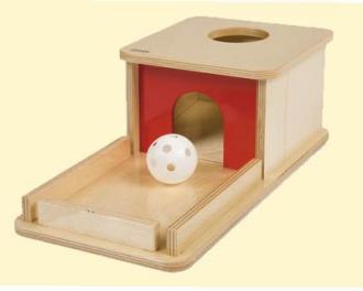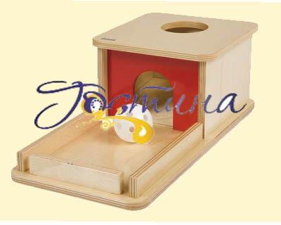 Матеріал призначений для дітей від 6 місяців.Дерев'яна коробочка з підносику і твердим пластмасовим кулькою. Дитина вчиться захоплювати кульку рукою, опускати його в отвір.