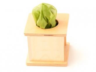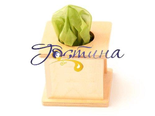 Даний матеріал призначений для дітей від 16 місяців до 2 років.Дерев'яна коробочка з великим отвором зверху і закріпленим всередині коробочки шарфиком. Витягнувши шарфик з коробочки, дитина вкладає його назад всередину хапальний рухами обох рук. Розвивається моторика, тактильні відчуття, концентрація уваги і координація рухів. Знайомство з поняттям 'довгий'.