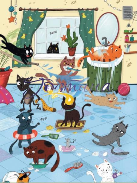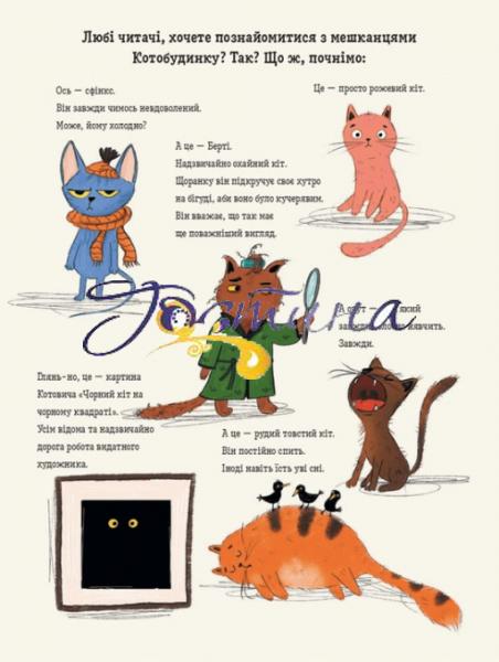 Перед вами — чудова й кумедна історія з життя котів у картинках. Усі вони живуть у Котобудинку, і в кожного — власний характер та звички і купа своїх котячих справ. Вони такі заклопотані, що навіть не помічають, коли в їхньому будинку оселилася маленька мишка. Допоможи котам відшукати малу бешкетницю! А ще в будинку оселилася курочка Дора, яка вже звиклася зі своїми пухнастими сусідами. Тож спецзавдання від Дори для геть дорослих читак — знайти й порахувати всі яєчка