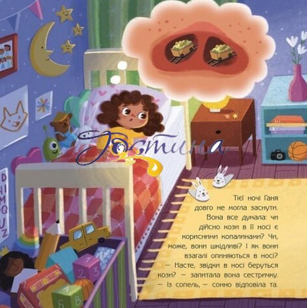 Серія «Дітям про інтимне» невтомно доводить: з дітьми важливо без сорому говорити про всі процеси, що відбуваються у їхньому тілі. І поява шмарклів і кіз у носі — не виняток! Ця дотепна та мудра книжка розповість про «копалини» людського тіла: соплі й кози з носа, закиси на очах та сірку у вухах. Чи корисні вони? І чи нормально, що вони з'являються в тілі? Як дотримуватися правил гігієни? Усе це дітлахи дізнаються разом із допитливими сестричками Ганею та Настею, які здійслили ціле дослідження про «копалини» людського тіла. А головне — навчаться правильно їх «видобувати»! Унікальна книжка на табуйовану тему. Книжка легко й гумором пояснює малечі правила особистої гігієни.