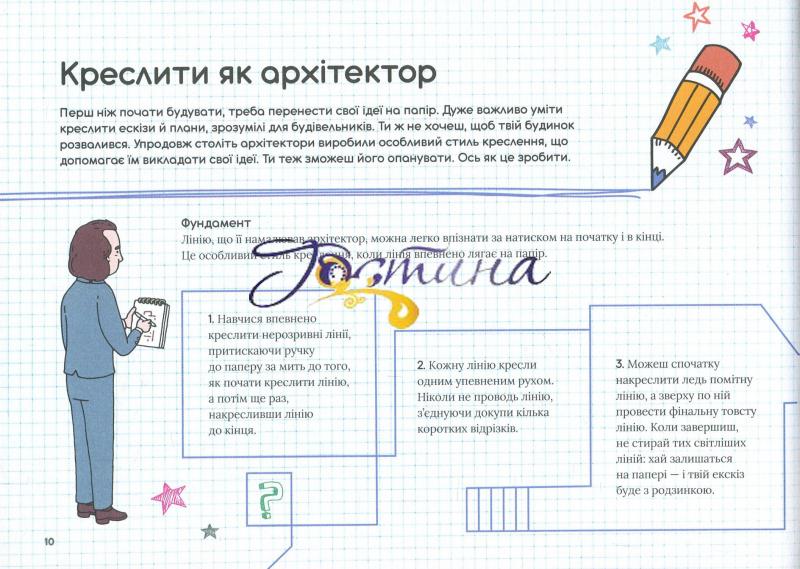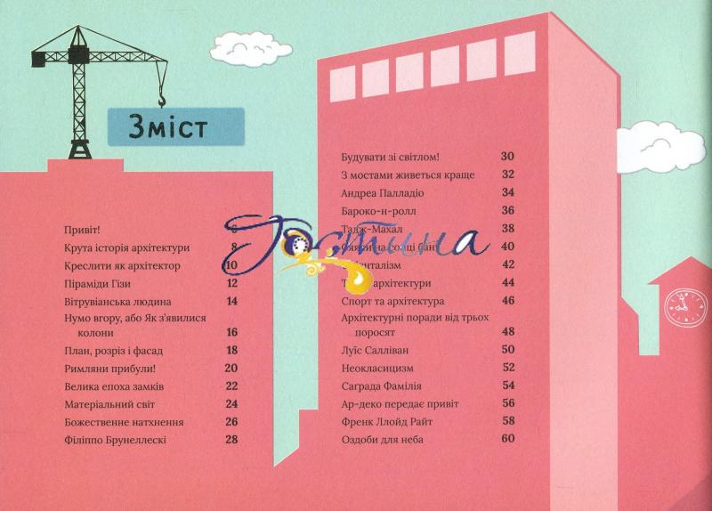 Ця книжка — чарівнии ключ до брами дивовижного замку під назвою «Архітектура». Вона розкаже про неимовірні архітектурні подвиги, геніальні винаходи та дивовижні досягнення. Познаиомить читачів і читачок із наивідомішими будівлями світу — від пірамід Гізи й собору Саґрада Фамілія до фантастичних будівель Захи Хадід, хмародерів у Дубаї і лондонського Уламка. Книжка розкаже про основні стилі архітектури, від найдавніших до найсучасніших, та про знаменитих архітекторів: Брунеллескі, Ллойда-Райта, Тадао Ондо та інших. А тих, хто мріє в маибутньому займатися цією справою — навчить креслити як справжні архітектори.