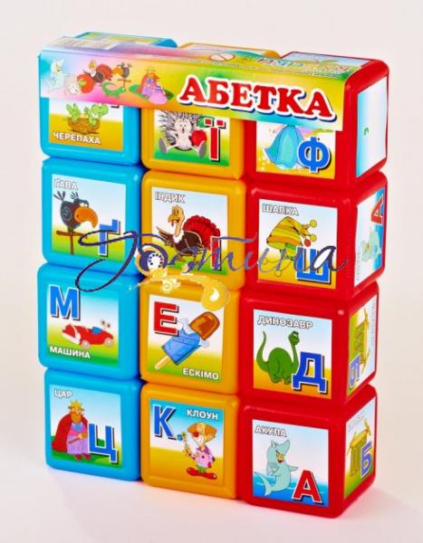 Кубики зроблені з високоякісної пластмаси, наклейки глянцеві паперові. Малюнки на етикетках мають букви українського алфавіту та зображення різних предметів. У наборі: 12 кубиків Розмір кубика 5,5х5,5