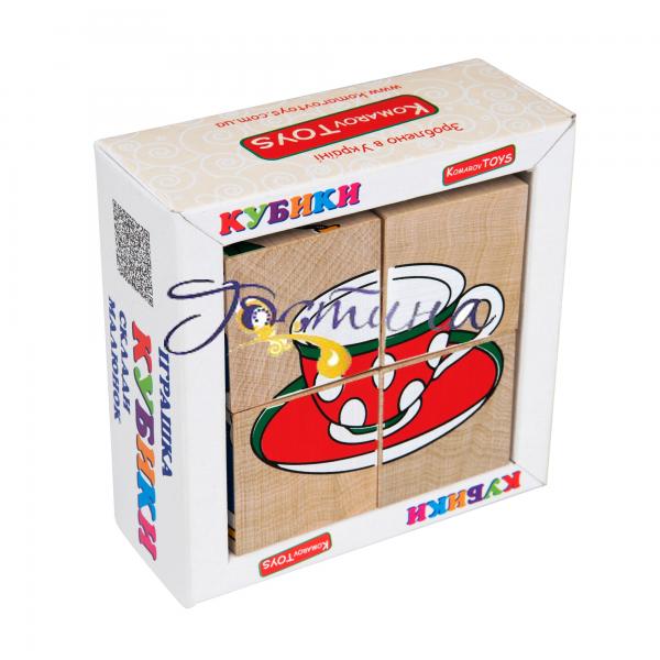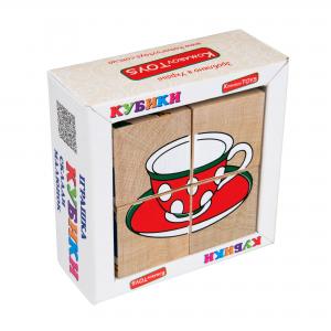 Кубики. Склади малюнок “Посуд” – складається з 4-х кубиків, розміром 4х4 см. Корисна іграшка допоможе дитині розвинути уяву в процесі гри. Набір укомплектований картками з зображенням реального розміру. В наборі “Посуд” такі малюнки: тарілка, глечик, чайник, пательня, кружка з блюдцем, кастрюля.