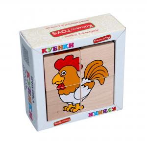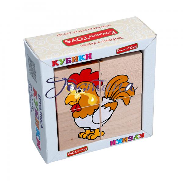 Кубики. Склади малюнок “Свійські тварини” – складається з 4-х кубиків, розміром 4х4 см. Корисна іграшка допоможе дитині розвинути уяву в процесі гри. Набір укомплектований картками з зображенням реального розміру. В наборі “Свійські тварини” такі малюнки: качка, собака, коник, корова, свиня, півень.