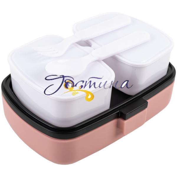 Ланчбокс розділений на дві частини, містить всередині 2 додаткові окремі ємності, які закриваються; має пластикову ложку та виделку. Це дуже зручно та гігієнічно.